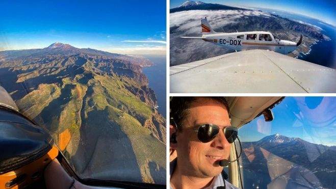 "Fue un proyecto con un señor inglés, John Nowell, que es el autor del libro. Me pidió colaborar con él, que ya tiene varios libros de volar por el mundo. Encontró en Twitter mis fotos y le cedí las mías para el libro y me incluyó como co-autor. Ahí se muestra la belleza de la isla de Tenerife y eso fomenta un poco el turismo, porque yo trabajo en turismo, no me dedico a esto de volar todavía de forma profesional".Who can recognize this island? 🤔😅🍀 #canaries #sky #avgeek #clouds pic.twitter.com/WRwOhY7Nw3