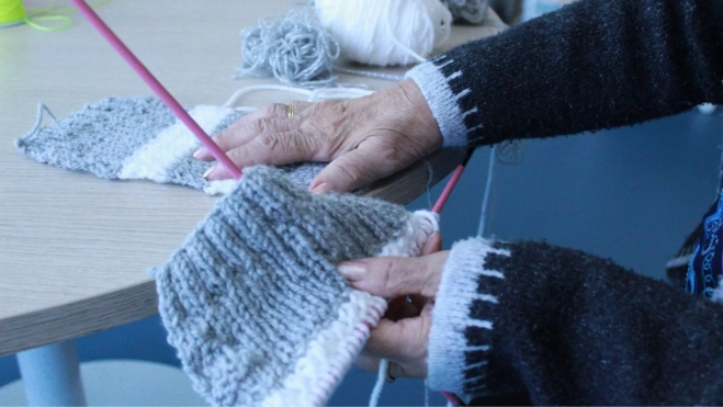 “Yo trabajaba dando clases de confección. Tenía dos máquinas de coser, una industrial y otra transportable”, cuenta Magdalena, usuaria de la residencia CleceVitam Vía Ronda de La Laguna, mientras muestra la prenda en la que está trabajando con sus agujas de punto.