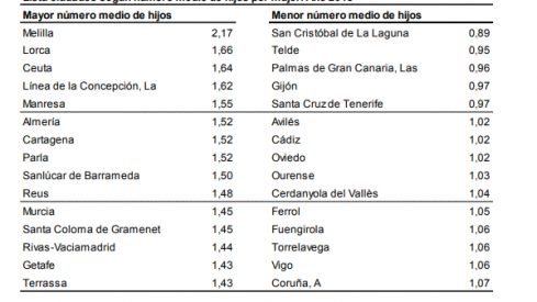 Cuatro de las cinco ciudades españolas con menos nacimientos por cada mujer censada forman parte del archipiélago canario. En concreto, las dos capitales de provincias, Telde y San Cristóbal de La Laguna forman parte de los más alto de este ranking, siendo la ciudad de los Adelantados la que ocupa el primer puesto, con un promedio de 0,89 hijos por mujer; seguida de Telde, con 0,95 hijos por mujer; y de Las Palmas de Gran Canaria, con 0,96 de promedio. Santa Cruz de Tenerife se situaría en la quinta posición con un promedio de 0,97 hijos por mujer.Así consta en la estadística anual de indicadores urbanos del Instituto Nacional de Estadística, en la que incluye a las 416 urbes que superan los 20.000 habitantes. Según el INE, "este indicador se define como el número medio de hijos que tendría a lo largo de su vida fértil una mujer residente en un municipio en caso de mantener la misma intensidad fecunda por edad que la observada en un año concreto en ese municipio".De esta forma se puede observar que las ciudades con mayor natalidad en proporción con su población femenina son Melilla, con 2,17 hijos por cada mujer, Lorca (Murcia), con 1,66, Ceuta con 1,64, La Línea de la Concepción (Cádiz) con 1,62 y Manresa con 1,55, según datos actualizados hasta 2018.