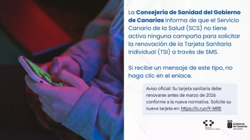 El Servicio Canario de la Salud (SCS), organismo adscrito a la Consejería de Sanidad del Gobierno de Canarias, ha informado a la población del Archipiélago de que no tiene en marcha ninguna campaña para solicitar la renovación de la Tarjeta Sanitaria Individual (TSI) mediante mensajes de texto.