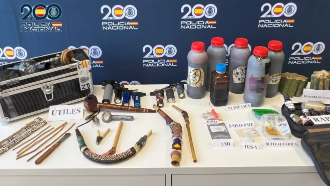 En el registro que tuvo lugar en la finca rural, la Policía Nacional intervino diferentes sustancias psicoactivas: ayahuasca, preparación psicoactiva cuyos efectos incluyen alteraciones en la percepción del tiempo y espacio; rapé, preparado de tabaco en polvo que se usa para maximizar los efectos de las sustancias intervenidas y así producir una mayor alteración los estados de conciencia; secreciones de sapo bufo, un potente alucinógeno; rana kambó, sustancia que provoca efectos fisiológicos intensos como el aumento de la frecuencia cardiaca o reducción de la presión arterial; cáctus de San Pedro, cuyo principal componente psicoactivo es la mescalina; LSD y 1.200 € en efectivo.