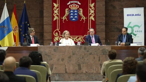 La sala Europa de la Cámara acogió este viernes el acto oficial de apertura del curso 2024-2025 de ECCA.edu. El evento contó con la participación de la vicepresidenta primera del Parlamento de Canarias, Ana Oramas; el consejero de Educación, Formación Profesional, Actividad Física y Deportes del Gobierno de Canarias, Poli Suárez; el director general de ECCA.edu, José María Segura Salvador, y el representante de la Compañía de Jesús, Juan José Tomillo.