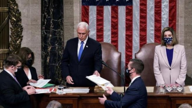 El Congreso de EE.UU. ratificó este jueves la victoria del presidente electo, el demócrata Joe Biden, en las elecciones de noviembre, tras una larga y extraordinaria jornada que incluyó un asalto al Capitolio para interferir en el proceso de confirmación de los resultados.La sesión conjunta de ambas cámaras del Congreso confirmó que Biden y la vicepresidenta electa, Kamala Harris, superaron la barrera de los 270 votos electorales que da las llaves de la Casa Blanca, con un total de 306, y por tanto llegarán al poder el próximo 20 de enero.El vicepresidente estadounidense, Mike Pence, que presidía la sesión, declaró que esa ratificación debía considerarse "suficiente" para aceptar la elección de Biden.Pence puso así fin a una sesión que comenzó a primera hora de la tarde del miércoles y quedó interrumpida por el violento asalto al Capitolio de los seguidores del presidente Donald Trump, un asedio que duró casi cuatro horas y se saldó con cuatro muertos, 14 policías heridos y al menos 52 detenidos.Unas dos horas después de que las autoridades consiguieran despejar el Capitolio y sus inmediaciones, ambas cámaras del Congreso volvieron a reunirse para seguir con el proceso de ratificación del resultado de las elecciones, que ya quedó confirmado en diciembre por el órgano competente en EE.UU., el Colegio Electoral.La nueva sesión duró más de siete horas debido al debate en ambas cámaras sobre dos objeciones al resultado de las elecciones en Pensilvania y en Arizona, ambas presentadas por los aliados de Trump.Como se esperaba, las dos cámaras votaron a favor de respetar lo votado en los comicios en esos dos estados, y la sesión conjunta continuó según lo previsto.Tras fracasar la objeción sobre Pensilvania, Pence siguió abriendo los sobres para contar el resultado relativo a cada estado, por orden alfabético, y no hubo más objeciones exitosas.Al empezar la jornada se esperaba que al menos trece senadores presentaran o respaldaran objeciones posiblemente en cuatro estados más: Georgia, Michigan, Nevada y Wisconsin.Sin embargo, el asalto al Capitolio disuadió a algunos de ellos de continuar con su plan, y ningún senador apoyó las objeciones que presentaron en esos estados varios congresistas republicanos.De acuerdo a la ley estadounidense, para desencadenar un debate y una votación en el Congreso sobre la posibilidad de rechazar el resultado en un estado, es necesario contar con al menos un congresista y un senador que apoyen la idea.Nunca hubo ninguna perspectiva de que las objeciones presentadas en el Congreso prosperaran, puesto que cada una de ellas debe superar una votación en el pleno y los demócratas, el partido de Biden, son mayoría en la Cámara de Representantes.No obstante, el presidente saliente, Donald Trump, insistió en presionar a los legisladores y a su propio vicepresidente, Mike Pence, para que se arrogaran unos poderes que no les corresponden bajo la Constitución e interfirieran en una sesión que normalmente es simplemente un trámite formal.