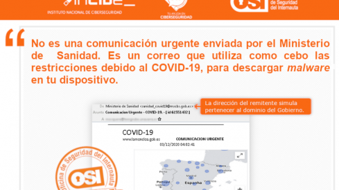 El Instituto Nacional de Ciberseguridad (Incibe) ha alertado este jueves que ha detectado una campaña fraudulenta de correos electrónicos que suplantan al Ministerio de Sanidad con un mensaje que incluye un falso comunicado sobre restricciones perimetrales de comunidades autónomas por la pandemia que esconde malware.El mensaje argumenta que hay un posible bloqueo de una ciudad debido a la covid-19 y para comprobarlo se debe descargar un fichero, ha informado el centro tecnológico en un comunicado.Sin embargo, advierte de que si se hace clic sobre el enlace se descarga un archivo con malware que al ejecutarse infectará el dispositivoEl correo en cuestión se identifica con el asunto: 'Comunicación Urgente - COVID-19. - ( id xxxxxx )' para captar la atención del usuario.No se descarta que existan otros correos con asuntos diferentes, pero con el mismo objetivo: incitar al usuario a descargar un fichero bajo algún pretexto de su interés utilizando para ello técnicas de ingeniería social.