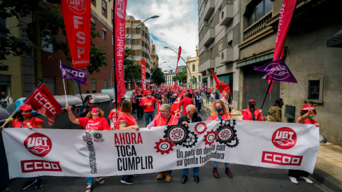 El sindicalismo ha retomado las calles en Canarias, tras el paréntesis forzado por la pandemia de la covid-19, en un Primero de Mayo en el que las centrales han coincidido en reivindicar el cumplimiento de "la deuda" que, creen, tiene el país con la clase trabajadora.Con motivo del Día internacional del trabajador, ha habido manifestaciones en todas las islas, las más concurridas, en las dos capitalinas, en las que los sindicatos convocantes se han esforzado en garantizar las distancias de seguridad. En Santa Cruz de Tenerife han recurrido a largas cuerdas, tras la pancarta de la cabecera, para dividir en cuatro carriles la fila de manifestantes.Cuestiones de precaución aparte, los sindicatos han recalcado que este Primero de Mayo ha de obrar como "un punto de inflexión" en las reivindicaciones al Gobierno central.El secretario general de UGT en Canarias, Manuel Navarro, ha señalado a Efe que la intención es "recuperar la calle" para "poner sobre la mesa" una serie de exigencias como la derogación de la última reforma laboral y de las pensiones, y aumentar el salario mínimo interprofesional.Navarro ha subrayado que la sociedad canaria "tiene bastante incertidumbre" e incluso "miedo", sobre todo las cerca de 90.000 personas afectadas por un expediente de regulación temporal de empleo (ERTE). No cree que la población canaria esté "adormecida", pero reconoce que "desde hace muchos años adolece de cierta movilización".El secretario general de UGT Canarias ha asimilado por lo demás que "será inevitable que muchas empresas recurran a ERTEs", pero "lo que no podemos entender" es que, "el gran rescate" a la banca "lo vayan a pagar los trabajadores", mientras que los directivos tienen "unos suelos increíbles y unas indemnizaciones millonarias".En Las Palmas de Gran Canaria, el secretario general de CCOO en Canarias, Inocencio González, ha explicado que este sindicato ha escogido este año el lema "Ahora toca cumplir" porque considera que "este país tiene una deuda con la gente trabajadora".Por ello, reivindica que el Gobierno de España "comience a cumplir los compromisos del pacto" que lo sustenta, que quedaron en suspenso cuando se declaró el estado de alarma, en marzo de 2020, porque, según González Tosco, "está costando retomar esa agenda social" en asuntos como la reactivación del diálogo social y la negociación "real" sobre pensiones públicas y el incremento del salario mínimo.Si la vacunación frente a la covid-19 permite reanudar este año la actividad, ha advertido, nos encontraremos con un Estatuto de los Trabajadores "con dos reformas, especialmente grave la de 2012, que desequilibran las condiciones en la negociación colectiva hacia los empresarios del país".González Tosco también ha urgido al Gobierno español a que "se siente" en la mesa del sistema público de pensiones "con propuestas concretas e inicie una negociación real" que ponga fin a anuncios por parte de ministros "que acaban por retirarse".CCOO en Canarias también considera que el Gobierno debe negociar ya el incremento del salario mínimo interprofesional, una medida que beneficiará a más de 2.500.000 trabajadores a nivel nacional y a 130.000 en las islas; un colectivo que, según ha aseverado, "sufre situaciones laborales y salariales muy precarias". El secretario general de CCOO en Canarias ha recalcado que estos tres elementos forman parte de una campaña que este sindicato "afrontará conjugando la negociación con la movilización".Sobre las secuelas de la crisis sanitaria en la economía canaria, tan dependiente del turismo, González Tosco ha dicho que CCOO exigirá que la ampliación de los ERTE "sea hasta que se reanude realmente la actividad".Al mismo tiempo, este sindicato defenderá que el paquete de ayudas a la recuperación de 1.144 millones de euros que ya se están repartiendo a empresas de las islas se concedan a aquellas sociedades "solventes que puedan garantizar el mantenimiento de la actividad"."No tiene ningún sentido que con el dinero de todos se esté subvencionando a empresas que, al final, vayan a convertir en ERE los actuales ERTES, desde nuestro punto de vista eso no es posible porque es una indecencia", ha aseverado.