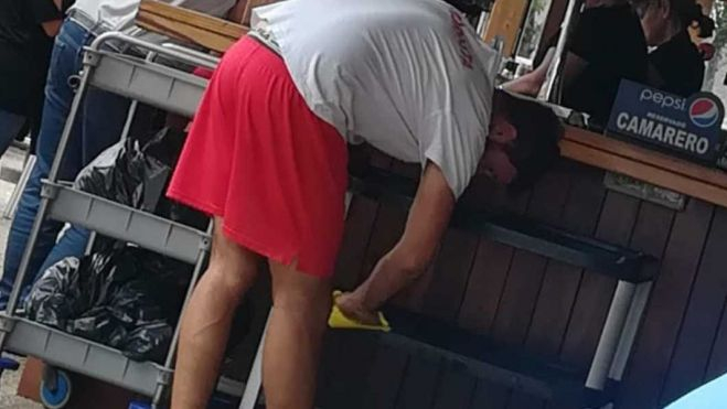 Añaden en la nota que en la imagen se aprecia a un socorrista, uniformado con pantalón rojo y camiseta blanca que, bayeta en mano,limpia un carro de hostelería emplazado en la zona de piscinas del establecimiento. El joven está de espaldas a la piscina donde en ese momento hay unos doscientos clientes. Como detalle, junto al profesional aparece sobre la barra un cartel: “Reservado Camareros”.