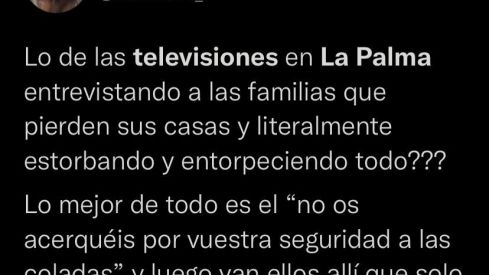 Los vecinos de La Palma llevan desde el domingo sufriendo los embates del volcán de Cumbre Vieja que ha sepultado ya unas 240 hectáreas dentro de un perímetro de 16 kilómetros. Las impresionantes imágenes que surgen de la emanación del magma y los estragos que este está generando tierras de cultivo y enclaves urbanos han hecho al mundo virar su mirada hacia la Isla Bonita, con el desembarco de numerosos medios de comunicación, en su mayoría reporteros gráficos y equipos de televisión, venidos de todas partes del Globo. Sin embargo, esta amplia cobertura televisiva ha generado malestar entre los habitantes de La Palma, enfadados por el tratamiento que se está haciendo del drama vivido en esta última semana y que las cadenas están cubriendo minuto a minuto. Las redes sociales dan buena cuenta de esta incomodidad y Twitter se ha llenado de declaraciones de los afectados que reprueban la actitud de los medios. Uno de los reproches más extendidos es la insistencia con la que muchos reporteros se dirigen a los vecinos para obtener las mejores declaraciones, sea por novedosas o por su valor humano, sin respetar el dolor de los damnificados que en muchas ocasiones se encuentran un tanto obligados a mostrarse frente a la cámara. He aquí algunos tuits criticando la actuación de los medios: