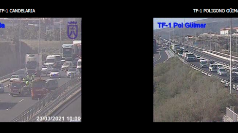 El impactante vuelco de un vehículo en el carril central de la TF-1 a la altura de Candelaria ha provocado el bloqueo total del tráfico en la autopista del sur sentido Santa Cruz.El accidente se produjo cerca de Candelaria, a la altura de playa Samarines, y las colas ya llegan más allá del polígono industrial de Güímar.