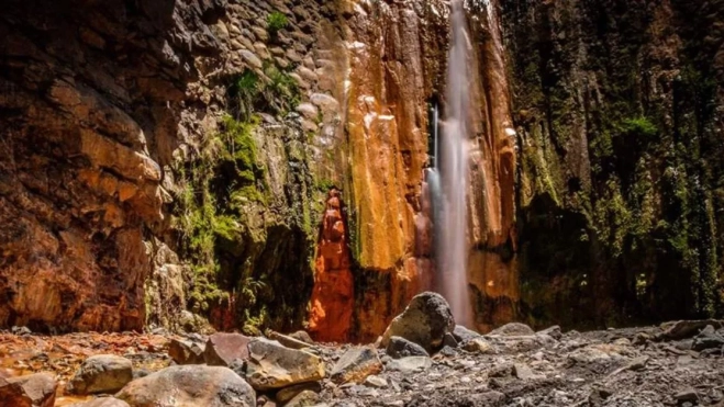 Si nos adentramos en la Caldera de Taburiente, que además de ser el espacio natural más conocido de La Palma es Reserva de la Biosfera, encontraremos un inesperado reclamo en nuestra ruta que, a pesar del entorno salvaje y volcánico que lo rodea, fue originado por la mano del hombre. Se trata de un salto de agua, producto de las obras que se realizaron en en el cauce durante los años 60 para aprovechar los recursos hídricos, que exhibe una peculiar paleta de colores.