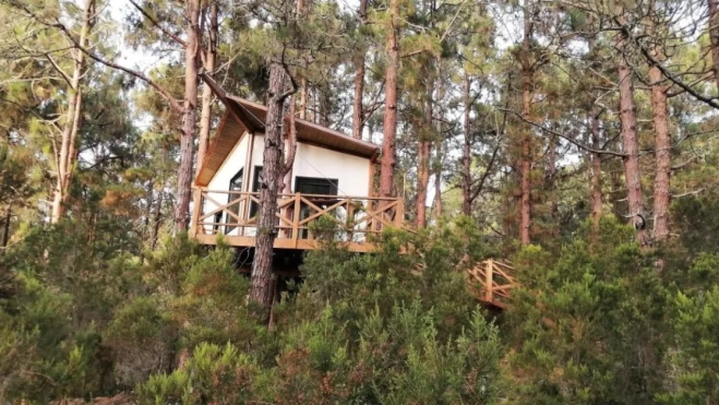 En sus 24 m2 el inmueble dispone de un dormitorio con cama doble, cocina equipada con nevera y microondas, así como un baño con bañera o ducha. Claro que lo más impresionante no se encuentra dentro, sino afuera. Si subimos por la pasarela de madera, desde la terraza se divisan una panorámica sobrecogedora del pinar con el mar como telón de fondo.