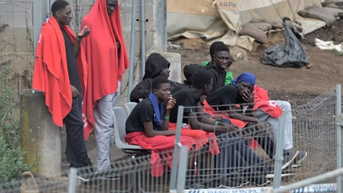 Varios inmigrantes subsaharianos llegados en cayuco a El Hierro conversan en el centro de atención temporal de extranjeros (CATE) de San Andrés, en Valderde. / GELMERT FINOL-EFE