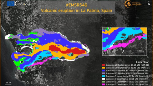 Según informa el Departamento de Seguridad Nacional, las rachas de viento han imposibilitado el vuelo de drones para conocer el número de infraestructuras afectadas por las coladas de lava. Los últimos informes sitúan la superficie total en 1.155 hectáreas con una anchura máxima de 3.350 metros, y se mantiene la extensión total de deltas lávicos en 48,03 hectáreas.