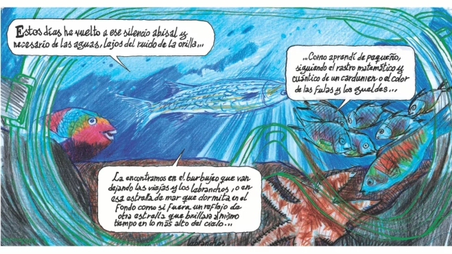 Uno no pensaba en esas trascendencias cuando se sumergía con doce o trece años. En ese momentos solo reconocíamos un viaje distinto y placentero al que ya no queríamos dejar de volver nunca. Nos olvidamos casi todo el año; pero cuando llega el verano y tenemos las gafas y el tubo, uno sabe que sí hay un camino de regreso a la calma. La encontramos en el burbujeo que van deando las viejas y los lebranchos, o en esa estrella de mar que dormita en el fondo como si fuera un reflejo de otra estrella que brillara al mismo tiempo en lo más alto del cielo.