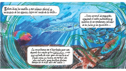 Uno se siente en casa en esas profundidades de rocas y de peces, como si regresáramos al líquido amniótico y diéramos vueltas y más vueltas sin conocer los libros o los coches, o los mapas y los colegios, como esas esporas que navegan con la memoria de las mareas, y que éramos nosotros hace millones de años, antes de que saliéramos a la superficie para ver lo que había más allá de las aguas, como queremos salir ahora para buscar vidas más allá de las estrellas.