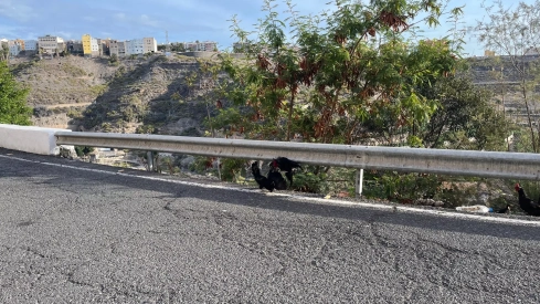 Hace unos días, dos gallos de esa tropa hippy del barranco, se empezaron a pelear como mismo había escuchado unos minutos antes que lo hacían en la Carrera de San Jerónimo, aunque solo con cacareos desde las bancadas, o como los del Parlamento italiano, a piña limpia, o como nos aparece ahora en todos esas redes sociales que, de repente, se han llenado de piñas, de patadas y de insultos en todos los idiomas, porque lo que importa es la violencia, y eso se entiende igual en suajili que en bable, como mismo se entendían las estridencias de los gallos cuando se tiraban el uno contra el otro al borde del asfalto. Por cierto, si miran la foto, verán lo desgastado que está el asfalto, y si miran con más detenimiento, comprobarán que está todo lleno de basura, y que en las laderas no hay más cemento porque no queda espacio donde mantener estable un andamio. Por ahí no pasan los que gritan, y si pasan estarán mirando sus pantallas para comprobar la repercusión de sus últimas estridencias. Al día siguiente, vi que los gallos habían hecho las paces y que esos grupos hippies de Phasianidaes comían hierbajos y que, de vez cuando, volaban unos metros como para comprobar que todavía mantienen las alas que les salven. Nosotros desaparecemos sin alas. En la evolución de nuestra especie, al paso que vamos, no creo que levantemos nunca los pies de la Tierra que estamos destrozando.