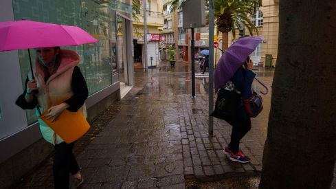 Viandantes en Santa Cruz de Tenerife protegiéndose con el paraguas de la lluvia que acompaña a la borrasca Celia./ EFE/Ramón de la Rocha Canarias