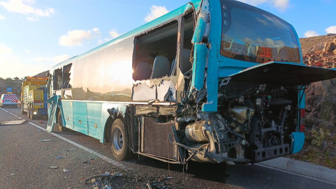 La línea 206 de la empresa Global ha colisionado contra un camión a las 6:20 horas de la mañana mientras circulaba dirección Las Palmas de Gran Canaria, a la altura de Montaña Blanca, Arucas.