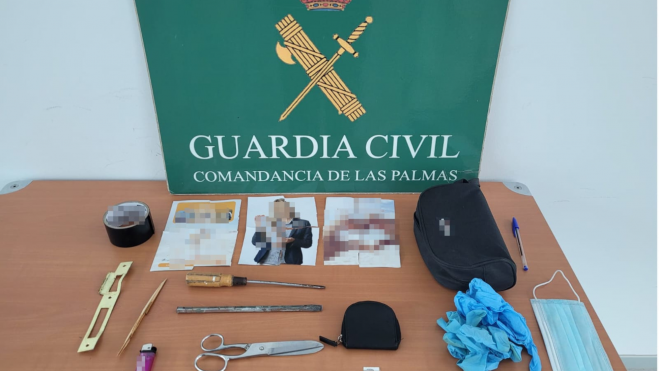La Guardia Civil localizó también varios objetos entre sus pertenencias, entre ellos, un rollo de cinta americana, tijeras, más guantes de látex, un mechero, un folleto del lugar donde trabaja la víctima hecho trozos, y una foto de la víctima tipo carnet.
