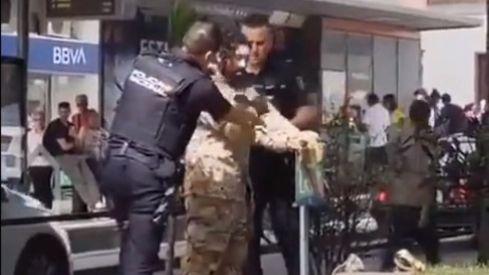 Según un vídeo publicado en redes sociales, se ve como agentes de la Policía Nacional instan al joven a quitarse las prendas militares para realizar un registro por seguridad tras haberle hecho salir del tranvía en la parada de la plaza Weyler.