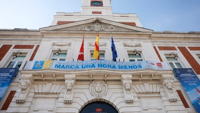 Desde las 09:00 horas de este 30 de mayo, el histórico reloj de la Puerta del Sol de Madrid tiene la misma hora que Canarias. Acompañado de una lona que ya luce en su fachada indicando este cambio y el por qué, se trata de un homenaje al Archipiélago con motivo del Día de Canarias.