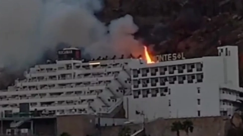 Un incendio en una ladera ha afectado a un complejo de apartamentos este miércoles la localidad de Puerto Rico, en Mogán. El fuego ha obligado a evacuar la quinta planta del edificio ante la proximidad de las llamas, según ha reportado el 1-1-2.