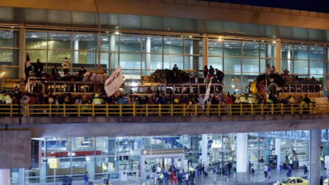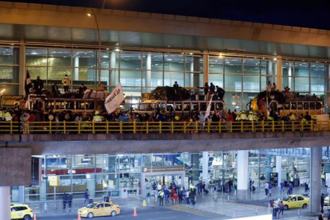 Este es un bloque de textoMás de un centenar de indígenas de los pueblos misak, pijao y nasa, se reunieron este jueves en el aeropuerto El Dorado, de Bogotá, con el principal objetivo de protestar contra la violencia que azota la región del suroeste del país en la que viven y así pedir al Gobierno colombiano que cumpla el acuerdo de paz que firmó con las FARC en 2016."Estamos exigiendo la implementación del acuerdo de paz y hacemos un llamado al país para cambiar el mal gobierno de Iván Duque", expresó a Efe Édgar Alberto Velasco, miembro del pueblo misak.Agregó: "Nuestra lucha es por defender la vida de los líderes sociales, de los líderes indígenas, de los defensores de derechos humanos. Nuestra lucha es en rechazo a las masacres".Los manifestantes hacen parte de la comunidad que el pasado 16 de septiembre derribó una estatua del conquistador español Sebastián de Belalcázar en Popayán, capital del convulso departamento colombiano del Cauca (suroeste), como forma de "reinvidicar la memoria de ancestros asesinados"."Se trata de un acto político de hacer presencia en este lugar denominado 'El Dorado', que nos evoca la razón por la que colonizadores se atravesaron el continente (...) arrasando pueblos y vidas a nombre de la espada y la cruz", dice un comunicado del Movimiento de Autoridades Indígenas del Suroccidente (AISO) leído en el aeropuerto.La protesta, según sus organizadores, hace parte de la minga indígena, como se le conoce a la manifestación de las comunidades que llegó el domingo a Bogotá y el lunes protagonizó una multitudinaria concentración en la Plaza de Bolívar para plantear sus demandas al presidente colombiano, Iván Duque, con quien no logró reunirse.La mayoría de participantes de la minga regresaron al suroeste del país el miércoles tras acompañar una jornada de multitudinarias protestas contra la política económica y social del Gobierno.CLAMOR POR EL CESE DE LA VIOLENCIAAl aeropuerto los manifestantes llegaron en chivas, como se conoce en Colombia a unos tradicionales y coloridos autobuses de las zonas montañosas, con carteles con mensajes como "Autoridades Nu Nachak-AISO rechazamos las masacres" y alzando banderas de colores que representan a sus pueblos.De igual modo, llevaron instrumentos musicales como tambores y flautas con los que interpretaron ritmos tradicionales que algunos de sus miembros bailaron en la entrada de la terminal aérea, a la cual entraron, según las autoridades, a la fuerza a pesar de las restricciones vigentes por la pandemia de la covid-19.El país vive un periodo de agitación política y social por las recientes masacres y el aumento de la violencia en regiones convulsas que han dejado cientos de muertos pertenecientes a comunidades étnicas, organizaciones de derechos humanos y movimientos políticos.A esos crímenes, condenados incluso por organismos internacionales, se suman los asesinatos de líderes sociales y firmantes del proceso de paz de 2016 entre el Gobierno y la antigua guerrilla de las FARC."Queremos que pare de correr sangre en los territorios, queremos garantías, justicia social con acciones en equidad y contando con la voz de los que trabajamos la tierra y llevamos alimentos y esperanza a los centros urbanos", añade el comunicado.