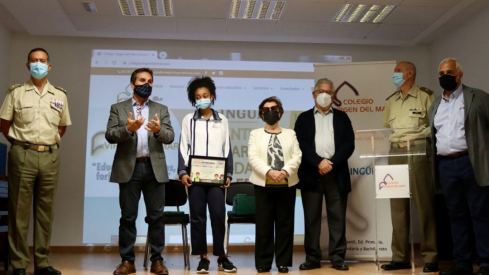 El pasado miércoles miércoles 28, en el Salón de Actos del Colegio Virgen del Mar, se entregó el Premio Provincial Carta a un militar 2021, a la alumna de 4º de ESO, Aisha Miranda Mangue.“Este premio corresponde a la Fase Provincial de Carta a un militar, y tras esta primera fase, la alumna Miranda Mangue, como el resto de los 54 colegios de España participantes, se encuentran ahora mismo en la revisión de jurado de la Fase Nacional, que se está realizando en el Ministerio de Defensa en Madrid”, explicó Luis Gimeno, subdelegado de Defensa durante el acto. Igualmente, se refirió a “la importancia de estos premios, porque no solo ayudan a los alumnos a desarrollar su creatividad literaria, sino a enfrentarse a un reto, a un proyecto, que han de superar y utilizar la destreza investigadora, algo que muy pronto se encontrarán haciendo en cualquiera de las facetas profesionales que les depare la vida”. El pasado Curso 2019-2020, el Colegio Virgen del Mar fue 2º Finalista Nacional en Carta a un Militar, con el trabajo presentado por la alumna Paula González.Se contó con la presencia del coronel Luis Antonio Martínez Gimeno, Subdelegado de Defensa de Santa Cruz de Tenerife, y del comandante, José Antonio Báez Santiago. Les acompañaron, en representación del Centro, el director Alberto Chinea, y los fundadores del Colegio Virgen del Mar, María Lola Rodríguez y Manuel Chinea, así como Domingo Jorge, profesor de Lengua y Coordinador del Proyecto Carta a un militar. El acto se realizó en el centro, cumpliendo las normas actuales Covid, no pudiéndose desarrollar en las instalaciones del Museo de Almeyda, como en ediciones anteriores. El público estuvo conformado por los 24 compañeros de Aisha Miranda, quienes también han participado con sus relatos en este certamen.