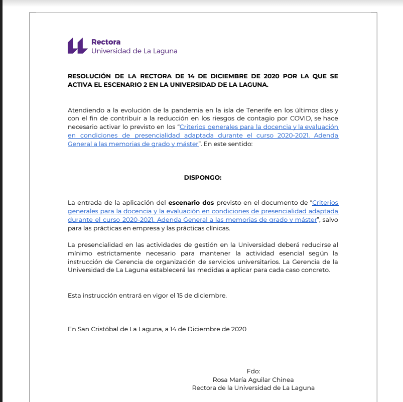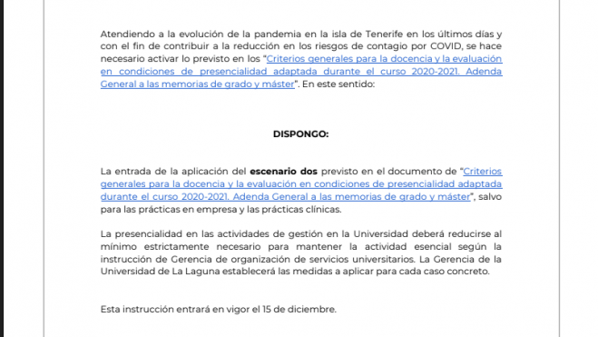 Ante el incremento del número de contagiados por la Covid-19 en Tenerife, la #ULL pasará al modelo de docencia no presencial.A partir de mañana toda la docencia, incluido los exámenes, pasará a ser online.Resolución de la rectora ⬇ https://t.co/9hrK1b7rdD pic.twitter.com/q3QkC7ilpE— Universidad de La Laguna (@ULL) December 14, 2020