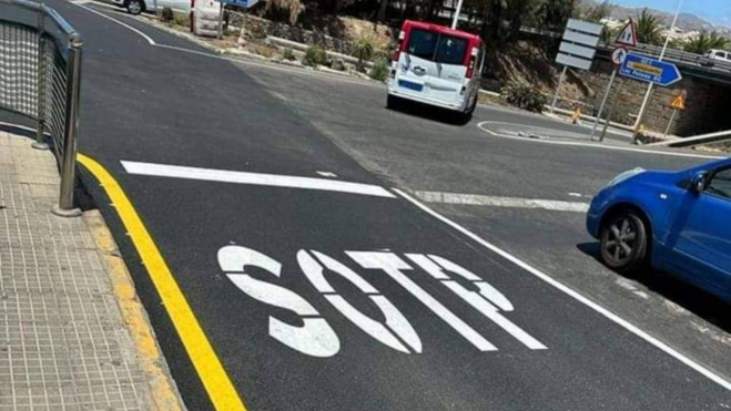 Donde debía de reconocerse la palabra "STOP", que indica a los coches la obligación de parar antes de reanudar la marcha, la calzada mostraba un "SOTP" de grandes dimensiones que ha obligado a los conductores a mirar dos veces ante la confusión de la palabra situada justo al lado del paso inferior que conecta con El Tablero