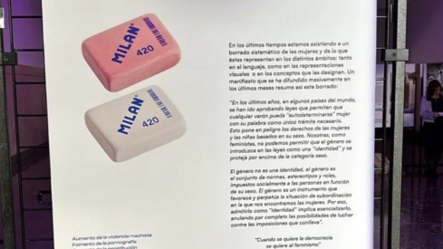 “En los últimos tiempos estamos asistiendo a un borrado sistemático de mujeres y de lo que estas representan en distintos ámbitos”, comienza argumentando el cartel, que está ilustrado con dos gomas de borrar. El mensaje que transmite es que el hecho de que varios países hayan aprobado “leyes que permiten que cualquier varón pueda ‘autodenominarse’ mujer” pone “en peligro los derechos de las mujeres y las niñas basadas en su sexo”.