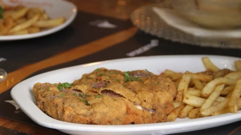 Todo ello viene con un acompañamiento crujiente de cebolla y puerros. Es uno de los platos estrella del Puerto Astur, en la calle Secretario Artiles, 49, y causa tanta sensación entre los comensales que llegan a preparar 300 cachopos a la semana para enviar a domicilio.