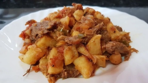 Por último freímos las papas, cortadas en cuadraditos y se mezcla todo. O también, si lo prefiere, directamente se va usted a Casa Franco y verá que antes de que pueda estar relamiéndose ya tendrá el plato sobre la mesa. Espere a probarla. Espectacular.