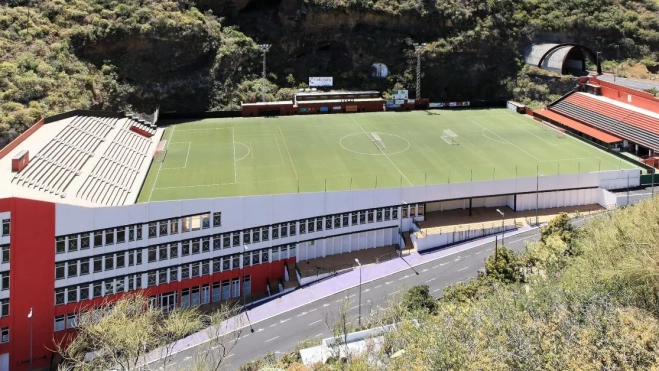 Uno de estos estadios únicos en el mundo se encuentra en Canarias y en sus instalaciones disputa sus partidos como local el CD Mensajero, de La Palma. Inaugurado en 1977 y remodelado en 2007 para albergar bajo la superficie de juego un área comercial y de oficinas, el estadio Silvestre Carrillo se encuentra en el barranco de Los Dolores de Santa Cruz de La Palma, inserto entre las laderas montañosas y muy cerca del mar, que puede divisarse desde fuera del campo en una estampa inigualable.