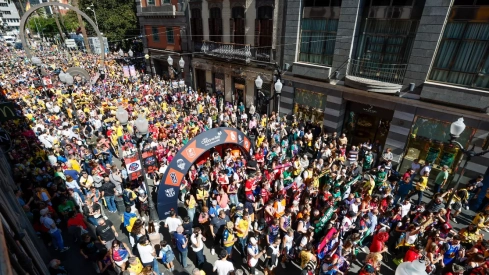 Entre cánticos de “esto, esto, esto es baloncesto” la comitiva arrancaba desde la Plaza de San Telmo cerca de las 12:00 horas y enfilaba la calle Mayor de Triana encabezados por el Frente Los Pollos Amarillos de La Laguna Tenerife y los chicos y chicas del Proyecto Suma, del Dreamland Gran Canaria.