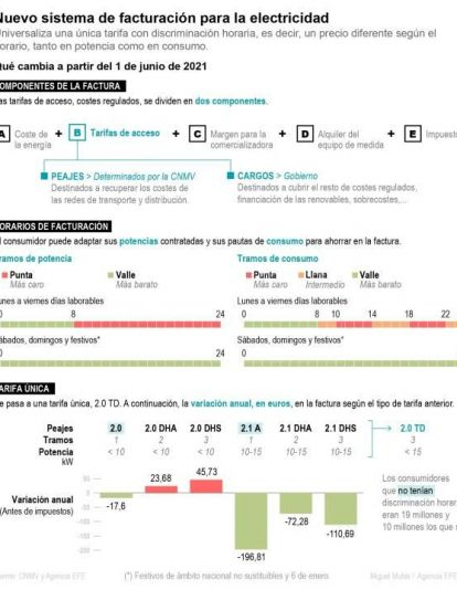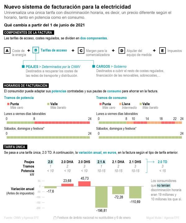 Junio se estrenará con nuevas tarifas eléctricas que premiarán al consumidor más eficiente, aquel que sea capaz de trasladar su consumo a las horas y días en que los precios son más bajos -durante la madrugada y los fines de semana y festivos-, pero habrá que tratar de consumir menos en los horarios más caros para evitar sustos.Pero las tarifas de la luz son sólo una parte de la factura. La otra la conforman el coste de la energía, el margen para la comercializadora, el alquiler del equipo de medida si el contador no se tiene en propiedad, y los impuestos (IVA del 21 % e impuesto sobre la electricidad del 5,1127 %). No obstante, el cambio no es menor, pues las tarifas (la suma de los dos conceptos que sirven para pagar los costes regulados del sistema eléctrico: los peajes y cargos) suponen entre el 50 % y el 55 % de la factura final de un consumidor doméstico.Los peajes se cobran para recuperar los costes de las redes de transporte y distribución, necesarias para que la luz llegue a los domicilios, comercios e industrias; mientras que los cargos están destinados a sufragar la financiación de las renovables, la compensación del 50 % del sobrecoste de la producción eléctrica en los territorios no peninsulares y las anualidades del déficit del sistema eléctrico de años anteriores.Ahora se va a aplicar un cambio a partir del 1 de junio en las tarifas porque se ha modificado la metodología de cálculo de los peajes, que fija la Comisión Nacional de los Mercados y la Competencia (CNMC), y los cargos, que corresponde fijar al Gobierno. Un cambio que universaliza la discriminación horaria, que antes se aplicaba sólo a una serie de tarifas, y que ahora se extiende con la unificación de todas las tarifas existentes en una única para los consumidores domésticos.Los beneficiados serán los 19 millones de consumidores que hasta ahora no tenían discriminación horaria, mientras que la factura por peajes y cargos se incrementará para los 10 millones que ya tenían discriminación y tenían un precio más barato. Para los primeros, el componente regulado de la factura se va a reducir un 6,7 %, mientras que para los segundos aumentará levemente, en unos 2 euros al mes, según fuentes de la CNMC.Eso en principio y si el consumidor no hace nada, porque las nuevas tarifas introducen diferencias en los precios en tres periodos horarios y se podrán contratar dos potencias distintas, lo que bien utilizado por el consumidor le puede reportar ahorros muy significativos.