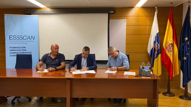 José Montelongo, director de la ESSSCAN, ha apuntado, durante la firma del convenio junto a Asamblea 7 Islas, que el acuerdo permitirá una colaboración constante entre el sindicato y la escuela, lo que facilitará la organización de formación específica orientada a la preparación de oposiciones, así como el uso de programas que simulan los test de los exámenes.