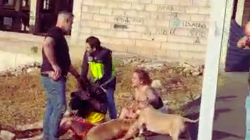 Uno de los canes, en un primer momento, permanece junto al detenido mientras que otros dos atacan a un agente que, para detener la embestida, emplea un palo para intentar asustar a los animales.