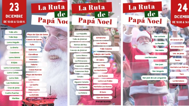 En la jornada del sábado, de 10.00 a 13.00 horas, la ruta que seguirá Papá Noel, por orden, será: Valle de los Nueve bajo y alto; Lomo Magullo; Los Arenales; La Breña; Cazadores; Lomo Bristol; El Ejido; Lomo Cementerio; Lomo Catela; Lomo Sala; Las Medianías; Cruz de Jerez; Cuatro Puertas; Piletillas; Playa Ojos de Garza; Caserío de Gando; Tufia; Salinetas; Clavellinas; Melenara; Taliarte; Casas Nuevas; Playa del Hombre; Los Melones; La Garita; Marpequeña; y La Estrella.