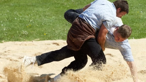 El Schwingen es un deporte suizo con siglos de historia. Se practica en círculos de serrín y enfrenta a dos luchadores —los Schwinger— que buscan derribar al oponente al suelo, sujetándolo por los pantalones de lona especiales que llevan sobre su ropa.