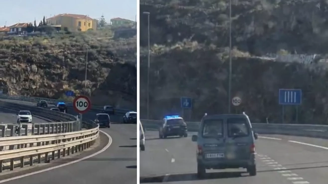 La autopista TF-1, a la altura de Barranco Hondo (Tenerife), fue el escenario de una persecución policial fallida este domingo. Un vídeo, que ha corrido por redes sociales como la pólvora, muestra cómo dos unidades de la Policía Nacional persiguen a un vehículo que huye de los agentes a toda pastilla.