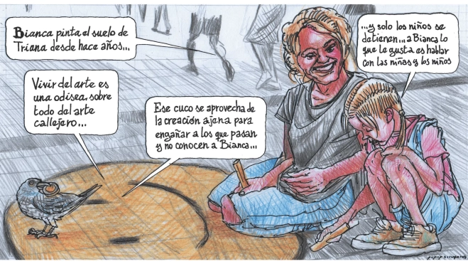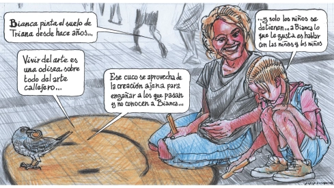 Bianca pinta el suelo de Triana desde hace años. Sus figuras tienen una perspectiva y un clasicismo que parece que por la noche se van a esconder en el subsuelo de la calle para volver a mostrarse al día siguiente. La gente pone algo de dinero cuando pasa, pero a veces no hay suerte y solo los niños se detienen hipnóticos ante la belleza que ella va improvisando.