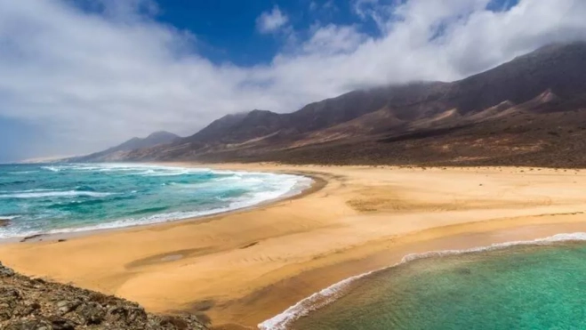 Su arena dorada y oscura se abre frente al Atlántico mientras detrás se alza el macizo montañoso de Jandía, creando una imagen única en las Islas.