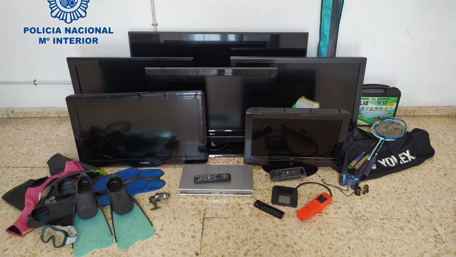 En el registro domiciliario los agentes intervinieron, entre otros efectos, seis televisores de diferente tamaño, prismáticos, un carrete de pesca, un DVD, un datáfono, una videoconsola, un frontal de un radio CD y numeroso material deportivo, objetos que están en proceso de devolución a sus legítimos propietarios.
