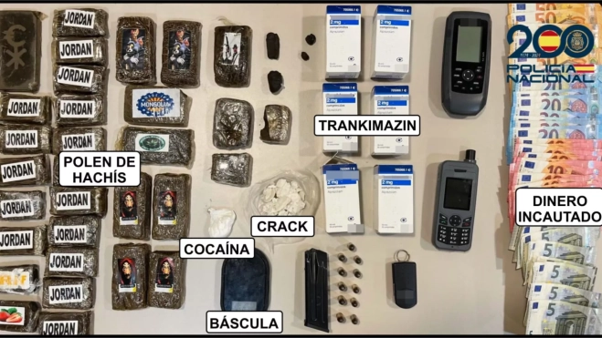 Con la correspondiente orden judicial, se realizó un registro en el domicilio del mismo donde le se le incautaron 9,7 gramos de cocaína, 23,8 gramos de crack, 1,2 kilogramos de hachís, 191 gramos de polen de hachís, 300 pastillas.