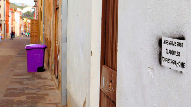 En una calle de San Cristóbal de La Laguna una pintada dice “Airbnb me sube el alquiler. Turist go home” y días antes de la manifestación dos ecologistas también irrumpieron en un acto hotelero. Para Pablo Díaz este clima de cuestionamiento del modelo turístico deriva de una mala gestión del territorio desde el punto de vista turístico. “Cuanto más masificado, más se van a ver estas situaciones de poblaciones locales que no se sientan implicados en el desarrollo de su territorio”, explica el antropólogo.