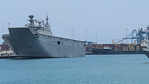 Las maniobras militares Sinkex 23, en las que participará el rey Felipe VI y que la Armada llevará a cabo en aguas canarias los días 29 y 30 de junio han traído hasta Gran Canaria al buque LHD Juan Carlos I que luce su esplendor atracado en el Muelle Santa Catalina Poniente, justo en la terminal de cruceros del Puerto de la Luz.