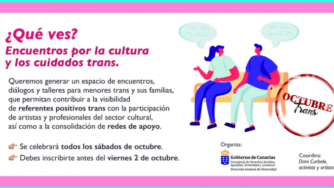 “¿Qué ves?” es el título de las jornadas programadas por la Consejería de Derechos Sociales, Igualdad, Diversidad y Juventud que permitirán generar un espacio virtual de encuentros, diálogos y talleres que contribuyan a la visibilidad de referentes positivos trans así como a la consolidación de redes de apoyo al enmarcarse en el contexto y panorama local de las Islas Canarias.Para participar es requisito imprescindible realizar una inscripción previa en https://forms.gle/GMfEGP1MAs2hhQUy5, el aforo es limitado. El objetivo es poder informar al grupo con antelación sobre cuáles serán las necesidades de cada jornada. Al tratarse de menores de edad se tendrá que facilitar una autorización expresa de un/a tutor/a legal para que puedan participar.Las jornadas, que comienzan este sábado, 3 de octubre, contarán con la participación de artistas y profesionales del sector cultural y se desarrollarán en sesiones de mañana y tarde a través de talleres específicos dirigidos por separado a familiares, pre-adolescentes trans (de 9 a 13 años de edad) y adolescentes trans (de 14 a 18 años de edad). Cada jornada finalizará con un espacio de conversación (de 19 a 20 horas) en la que participarán conjuntamente todas las personas asistentes y que estará dirigida por la creadora de estas jornadas, Dani Curbelo.