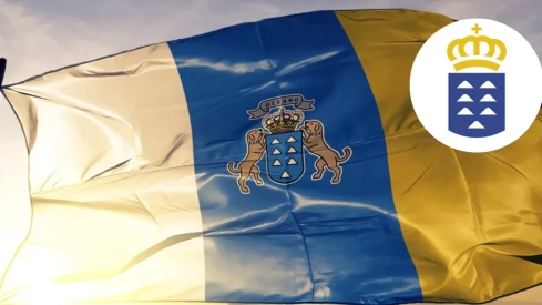 Canarias tiene escudo propio, cuya descripción es la siguiente: en campo de azur trae siete islas de plata bien ordenadas dos, dos, dos y una, esta última en punta. Como timbre una corona real cerrada, surmontada de una cinta de plata con el lema Océano de sable y como soportes dos canes en su color.