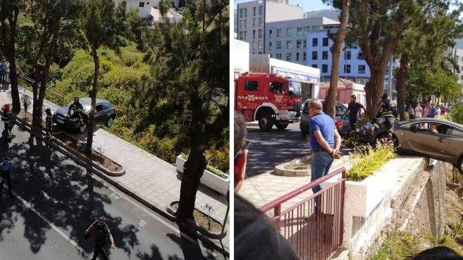Este jueves tuvo lugar un suceso de película con final feliz en Icod de los Vinos cuando un vehículo quedó suspendido con su conductor en el interior, necesitando la ayuda de los bomberos que tuvieron que hacer contrapeso para que no cayera.