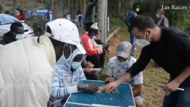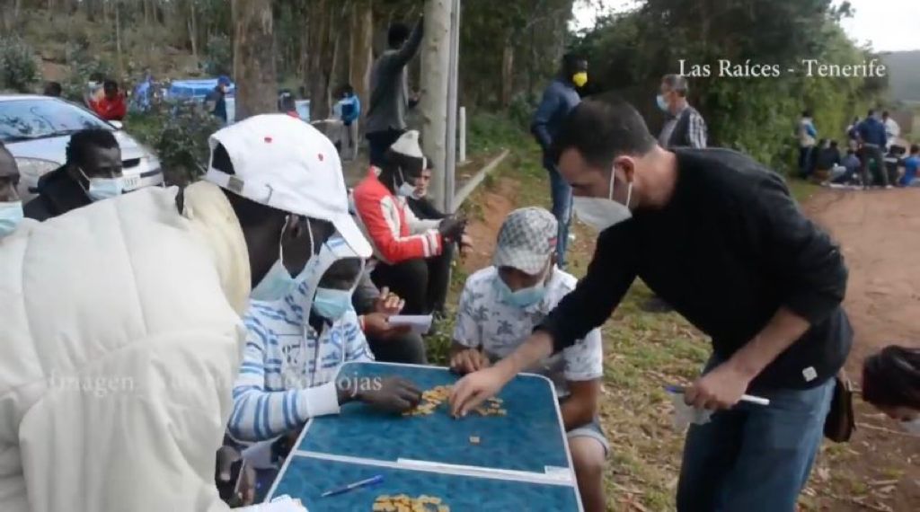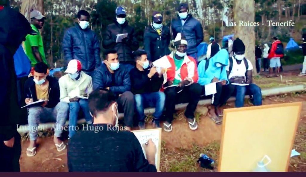 “La organización de las clases no es estricta. Además, cada día asisten personas diferentes y resulta complicado hacer un seguimiento”. Maribel García, profesora de idiomas de la Universidad de La Laguna recientemente jubilada, nunca imaginó compartir inglés, francés, castellano, árabe, wolof o bambala en una de sus clases.Maribel decide utilizar la pizarra como apoyo. “Hay quienes aprovechan para sacar fotos a la tabla”. A su alrededor, una decena de migrantes se distribuyen irregularmente sentados en palos, piedras sobre la tierra o incluso en pie. “Algunos llevan casi un año en Canarias y explican que entraron por el muelle de Arguineguín, en Gran Canaria”.Maribel se emociona al explicar que un chico de temprana edad le ha preguntado “por qué mi amigo se ha marchado de Las Raíces y yo no puedo irme con él”. Mantener la compostura ante tal declaración de humanidad es la más difícil de sus tareas, reflexiona Maribel.“No aspiran a seguir en Canarias. Su intención es continuar el viaje. Pese a las circunstancias, procuro generar un entorno informal preguntándoles si están casados o tienen novia. “Un hombre muy joven relata que dejó en su país de origen dos niñas y ahora se siente en la obligación de enviarles dinero”.Enseñar habilidades básicas y vocabulario útil es la preferencia de la ex profesora universitaria. “La geografía ayuda a interactuar”. Muchos aciertan a señalar en un mapa donde está Marruecos, España o Portugal pese a su precaria alfabetización. “¡Madrid! ¡Getafe! ¡Getafe!” Uno de sus alumnos reconoce a la ciudad madrileña a raíz del fútbol, pues en Getafe juega el defensa de origen togolés Djené Dakonam.Maribel propone un ejercicio de lista de palabras para aglutinar conceptos de buena o mala ética. “Enseguida se precipitaron en señalar a Tenerife en la columna de lo bueno y a robar y fumar dentro de lo malo”.Admite que resulta imposible memorizar nombres. “Quizá el de Ali, que se repite bastante”. Sin embargo, piensa que es entrañable el modo en que los migrantes la llaman con el nombre de “madre, hermana o amiga”.